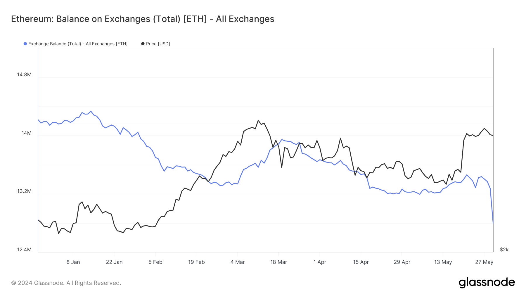 Ethereum balance across all crypto exchanges. Source: Glassnode
