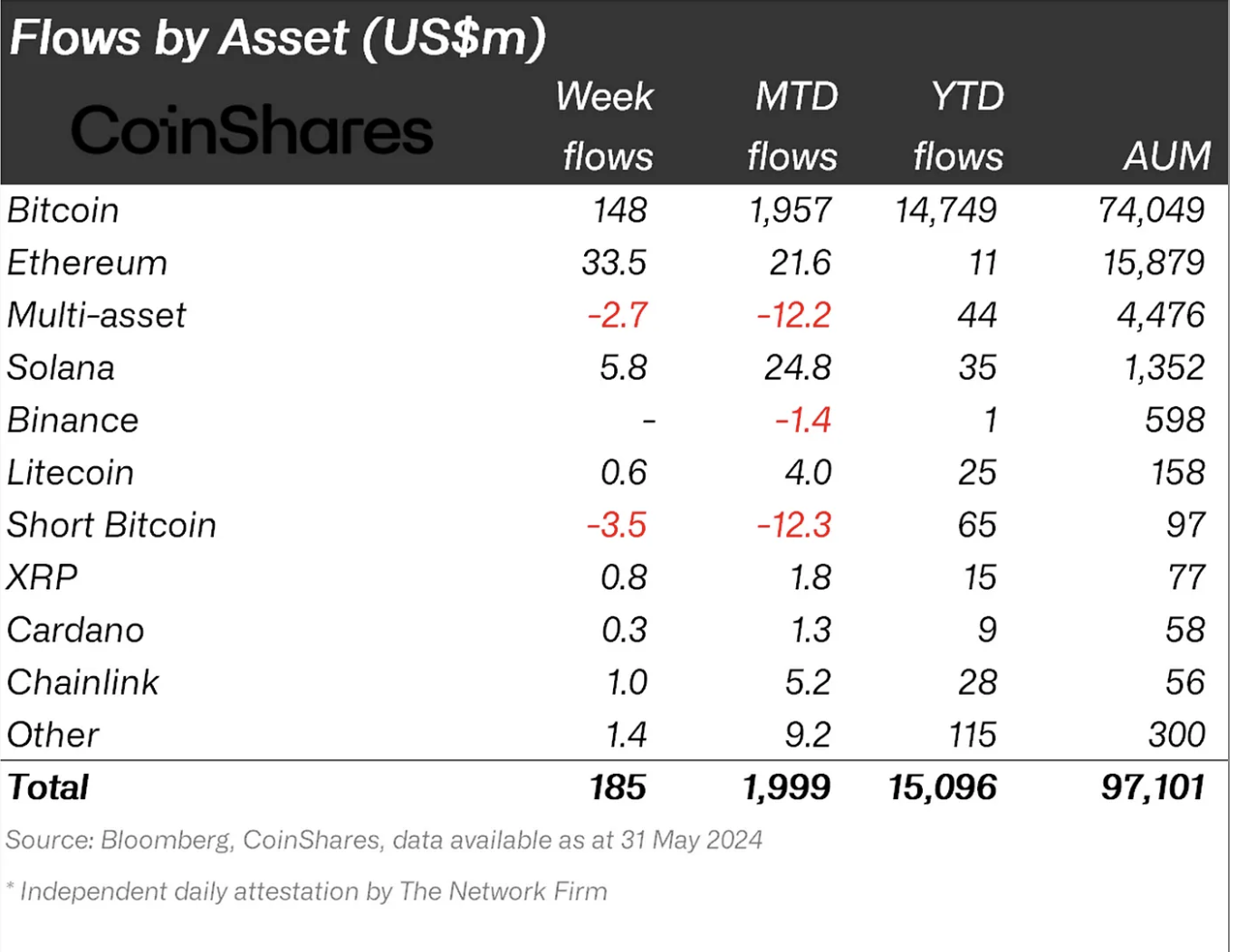 Crypto funds net flow by asset. Source: CoinShares