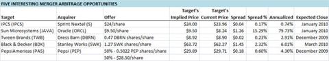 Finally, there's the Pepsi ( PEP ) and PepsiAmericas ( PAS ) deal where you see that consideration is given in 50% stock and 50% cash. This is simple enough. Calculate the spread as though the transaction were 100% stock. Then, average that with the value of the cash exchange. And, voila, the implied price!