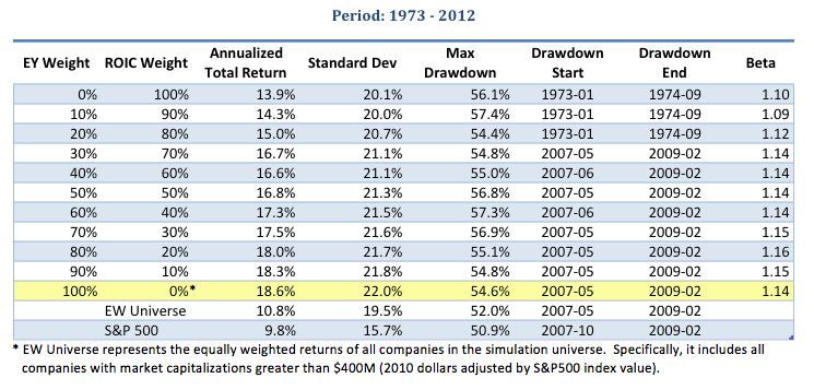 Euclidean examined 10 different weightings of the Good Price (using Earnings Yield) and Good Company (using ROIC) ratios over the timeframe from 1973-2012 - much longer than Greenblatt used in his book.