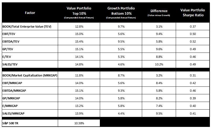 EBIT, EBITDA, and Gross Profit to Enterprise Value showed the best compound annual returns. All of the ratios using Enterprise Value improved upon the ratios that used Market Cap as the denominator. This, again, makes intuitive sense: