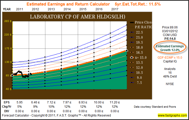 The consensuses of 16 analysts reporting to Capital IQ expect Laboratory Corp. of America to resume growing earnings at the rate of 12% per annum over the next five years. Consequently, we would argue that Laboratory Corporation of America appears very attractively valued at current levels.