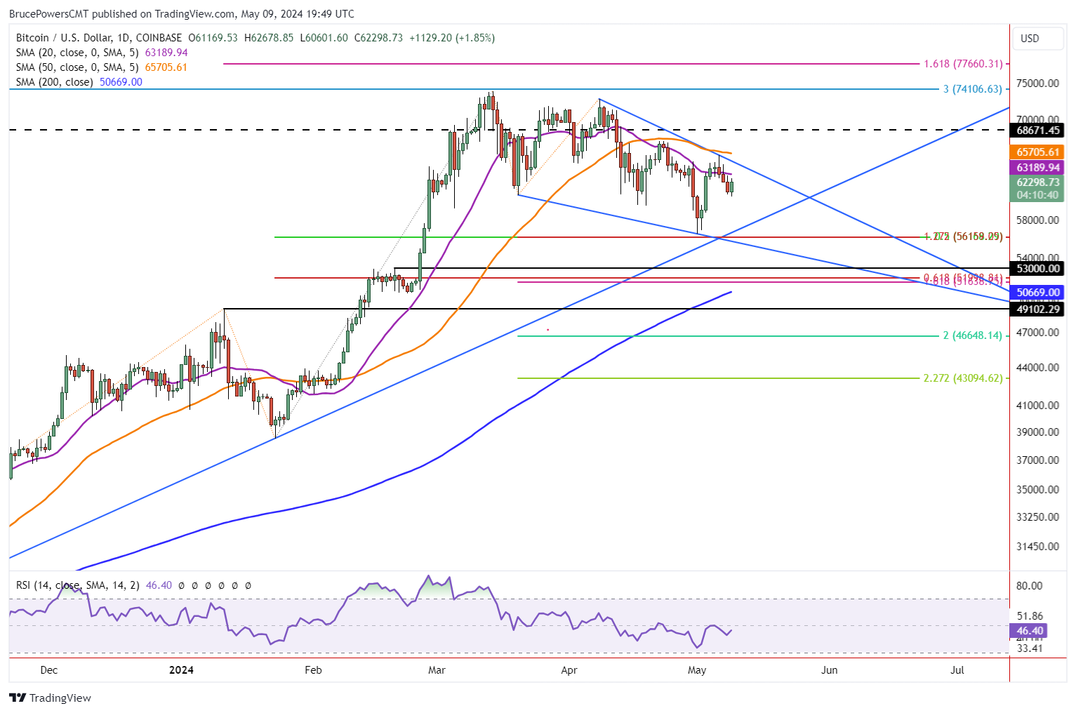 On the upside, a breakout of the top line of the wedge will be a sign of strength but a move above the recent swing high at 65,523 and the 50-Day MA, currently at 65,704, will be needed to confirm strength. If that happens, Bitcoin should be able to test and possibly exceed the highs.