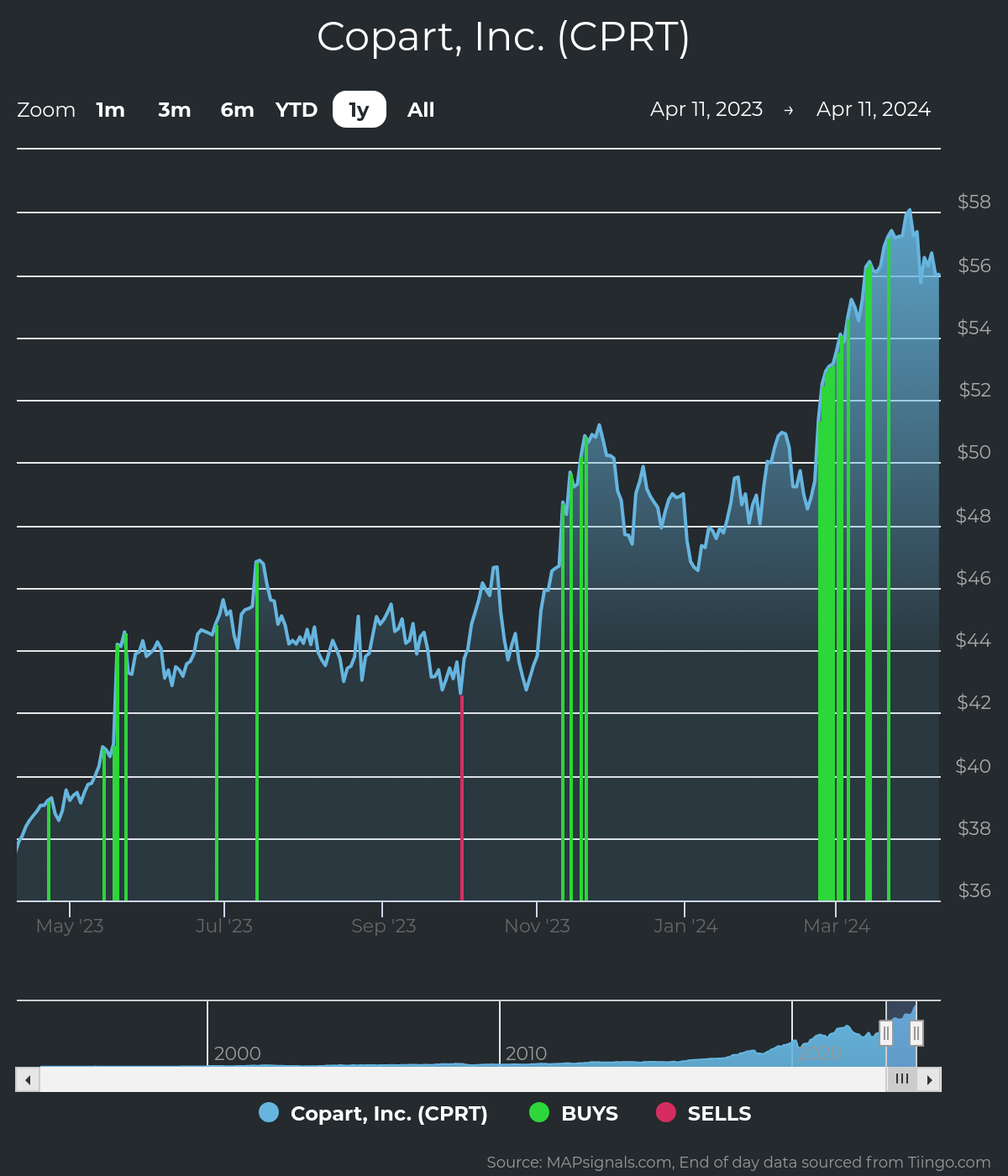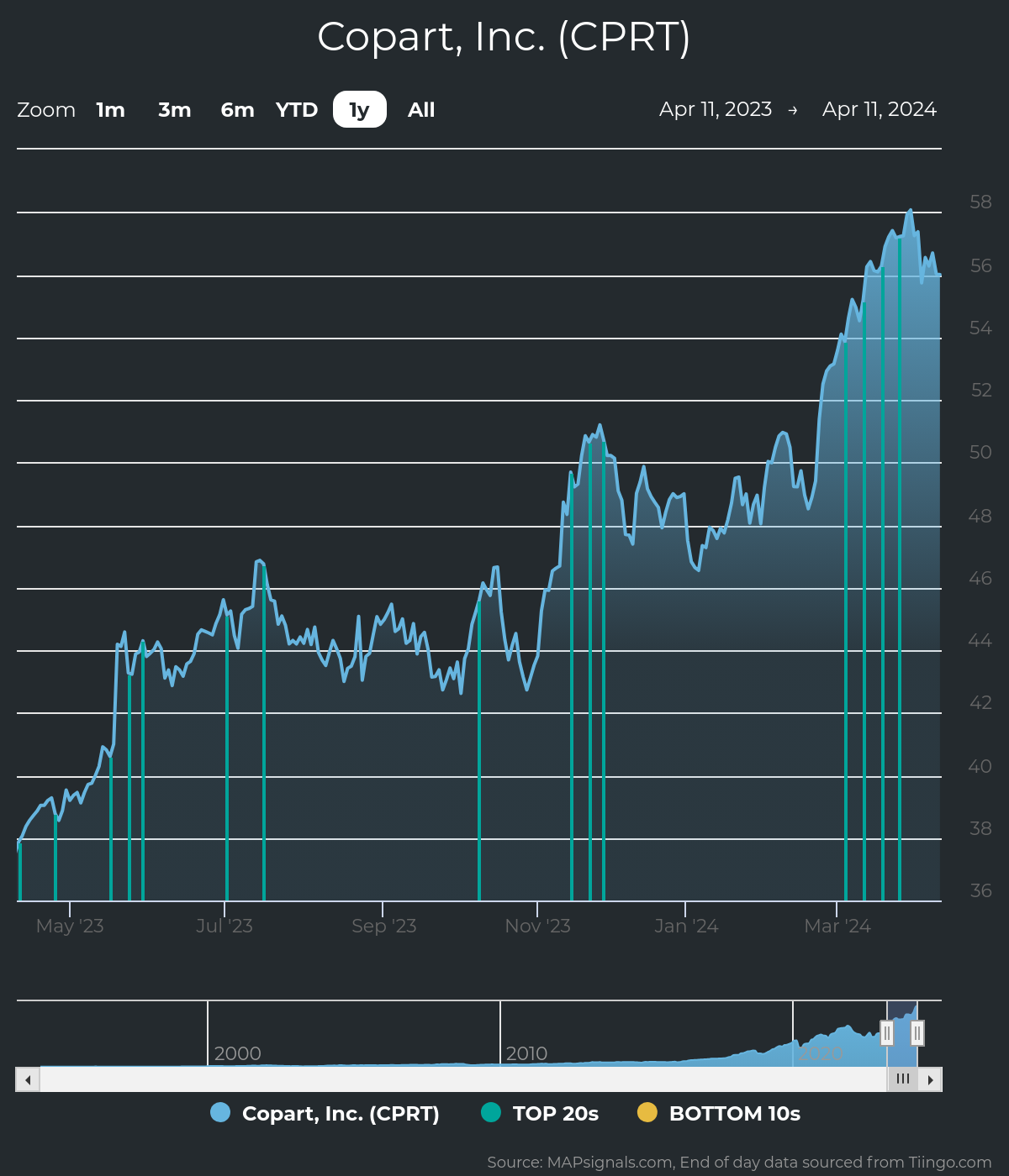 Each green bar signals unusual trading action in CPRT stock. The green color indicates our proprietary inflow signal: