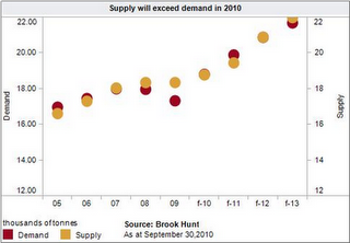 Many analysts are forecasting a supply shortage in 201,1 as the global economic recovery ramps up. Although estimates vary, the expected supply shortfall in 2011 ranges from 380,000 metric tons by BMO to Barclay’s 825,000 metric ton.