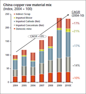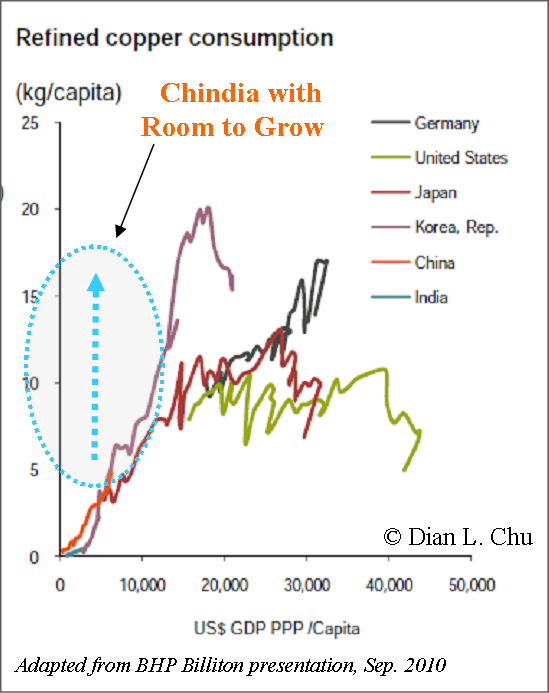 As deficient as China’s transportation system is, it also says a lot about the long-term consumption growth prospect of copper on a per capita basis (see Chart Below). Goldman Sachs, for example, is projecting copper at $11,000/mt (14% increase from the record high of $9,660 reached on LME), and believes that "prices could spike substantially above these levels, most likely in late 2011.”