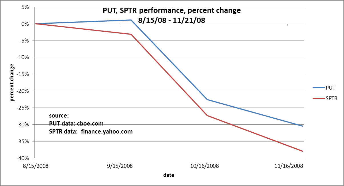 A real life example of this is given in the chart below using the actual performance of PUT and SPTR (monthly data, using third Friday of each month). From 8/15/2008 to 11/21/2008, SPTR declined falling 39.3%. PUT over the same period fell only 30.4%. In addition, the annualized daily volatility of PUT was 54.1% while SPTR's was 62.7%.