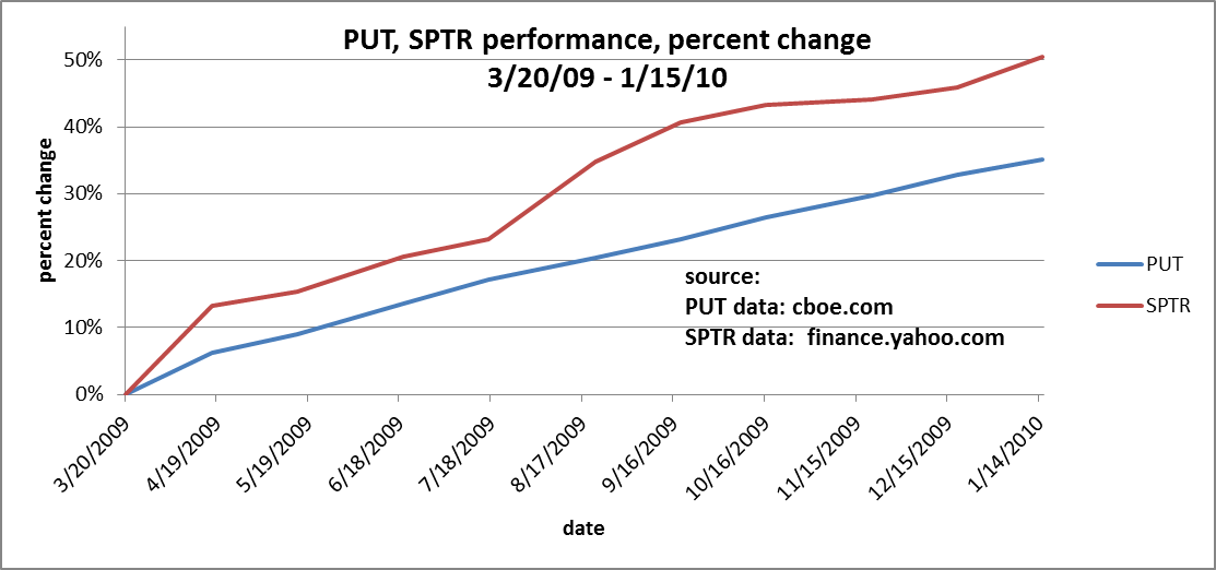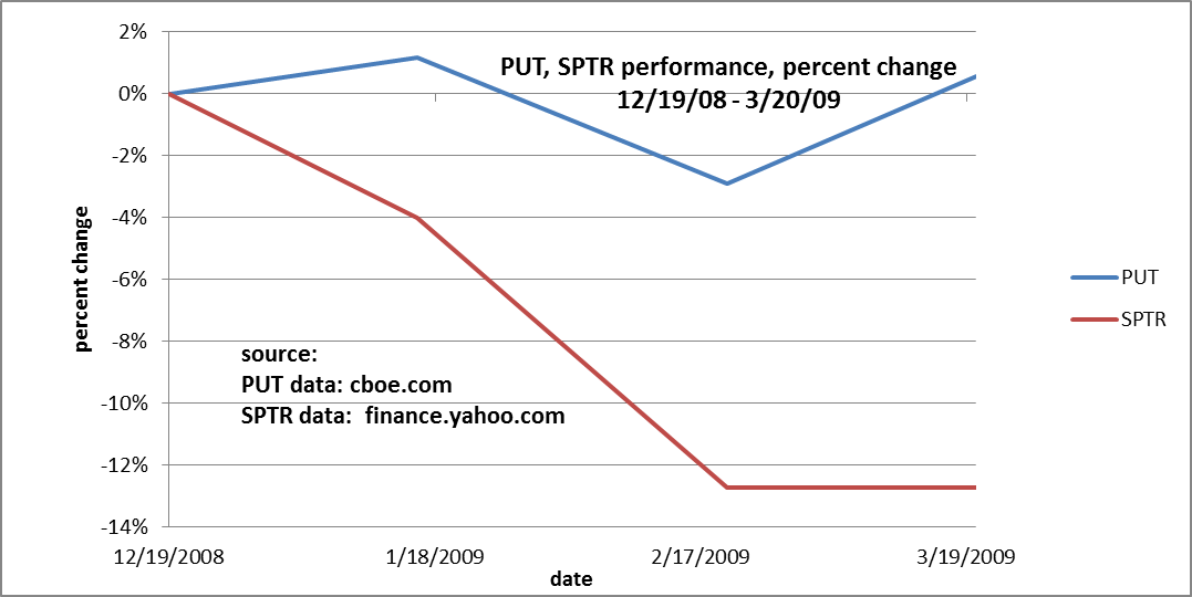 Another real-life example for this scenario is worth presenting and is presented in the chart below. In this example, SPTR had a negative return while PUT's return was positive. From 12/19/2008 to 3/20/2009, SPTR declined each month, falling 12.7%. PUT over the same period increased 0.6%. In addition, the annualized daily volatility of PUT over this time period was 26.6% while SPTR's was 38.3%. In this example not only did PUT outperform SPTR, but it also had a positive return while the underlying, SPTR, had a negative return.
