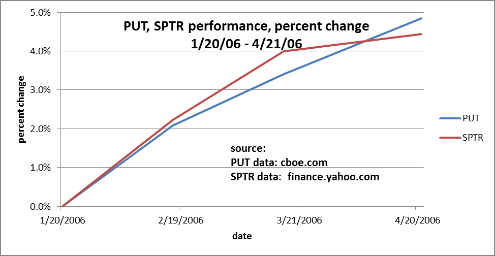 The second example is for the case where the SRCPWS does outperform the underlying and is given in the chart below using the actual performance of PUT and SPTR. From 1/20/2006 to 4/21/2006, the SPTR increased, steadily, by 4.43%. PUT over the same period increased 4.85%. In addition, the annualized volatility of PUT over this period was 4.97% while the annualized volatility of SPTR was 9.37%, over twice as much as PUT's.