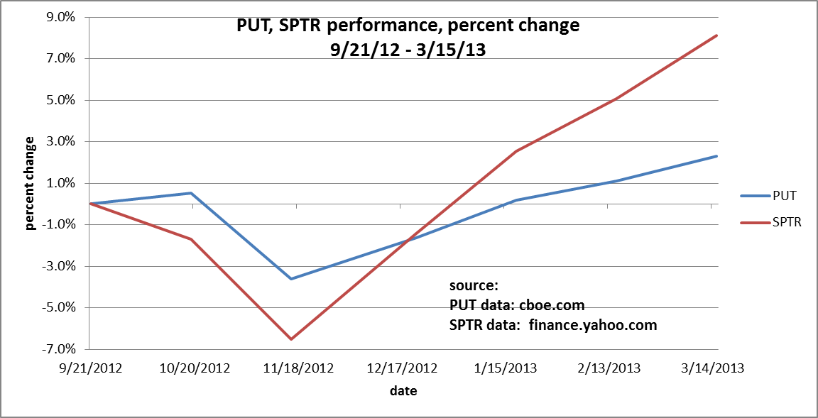 The chart below presents a real-life example using the actual performance of PUT and SPTR. The chart shows that from 9/21/12 to 11/16/2012, SPTR declined 6.51% while PUT declined only 3.63%. The chart then shows that from 11/16/12 to 3/15/13 SPTR increased 15.65% while PUT increased 6.17%. Over the entire period, SPTR increased 8.12% while PUT increased 2.32%. In addition, the volatility of PUT over the entire period was 6.73% while the volatility of SPTR was 11.63%