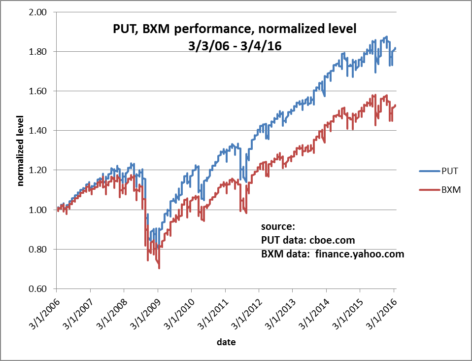 Earlier in this article I presented Maxim 3 : A covered put position is theoretically identical to a covered call position where both the puts and calls sold have the same strike . I further stated that covered put writing may provide certain advantages over covered call positions. When comparing the historical performance of the CBOE S&P 500 BuyWrite Index (a covered call index on the S&P 500 Index) and PUT, PUT handily outperforms. The chart below shows the PUT and BXM performance from 3/3/2006 to 3/4/2016: