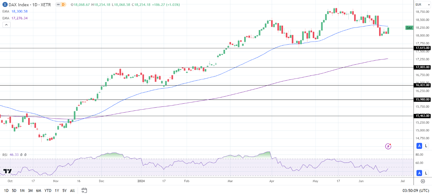A DAX break above the 50-day EMA would support a move to 18,500. If the DAX returns to 18,500, the bulls could target 18,750.