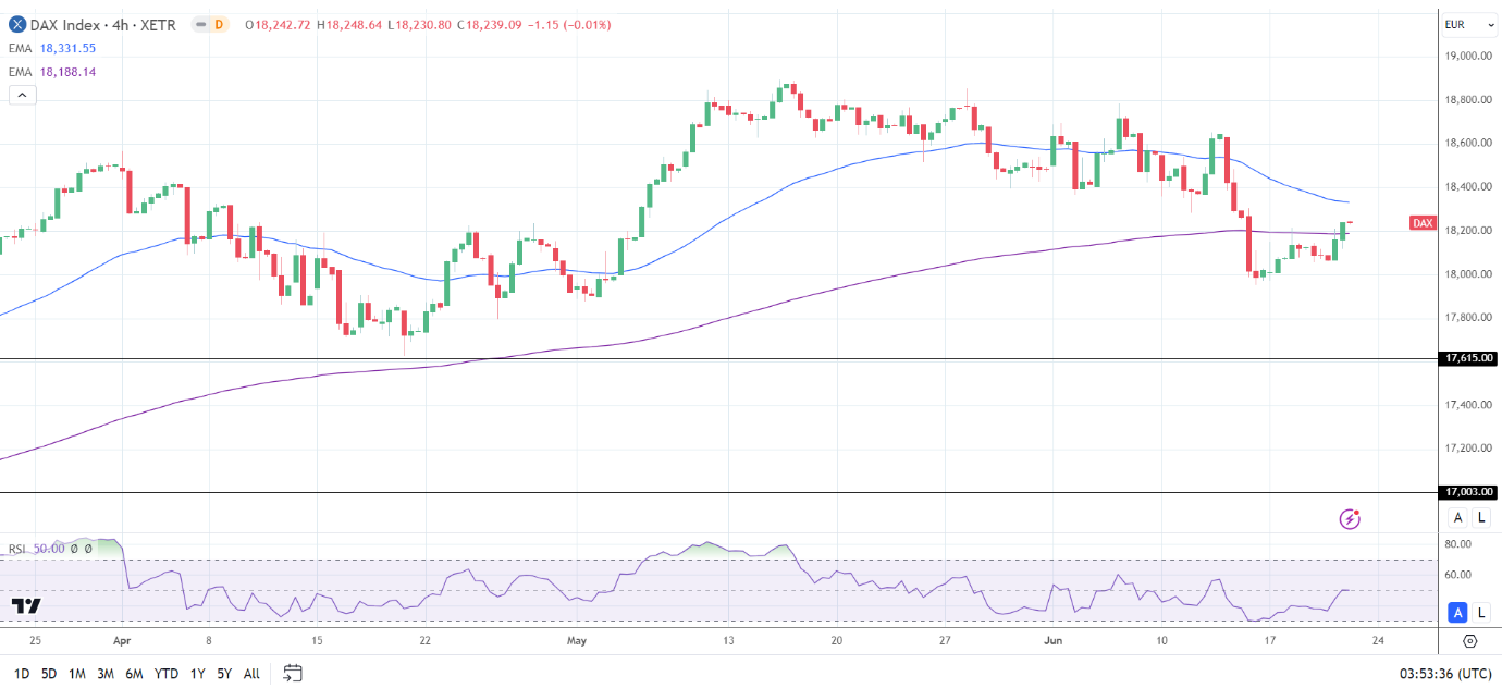 A DAX break above the 50-day EMA could signal a move toward the 18,500 handle.
