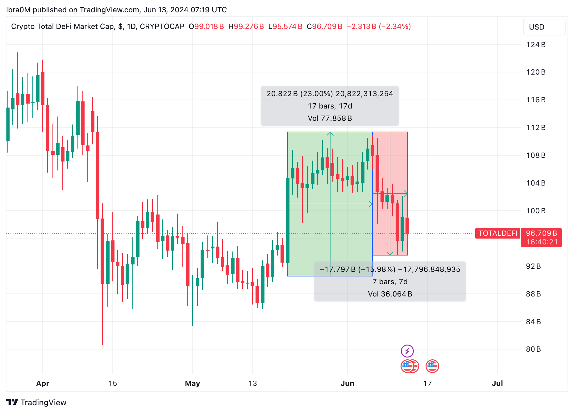 The chart above shows how the TOTALDEFI market cap surged by $20.8 billion, between May 21 and May 27 before the market correction phase triggered a 16% downsizing as the ETF issuers experience delays to the official market launch of the ETH derivatives.