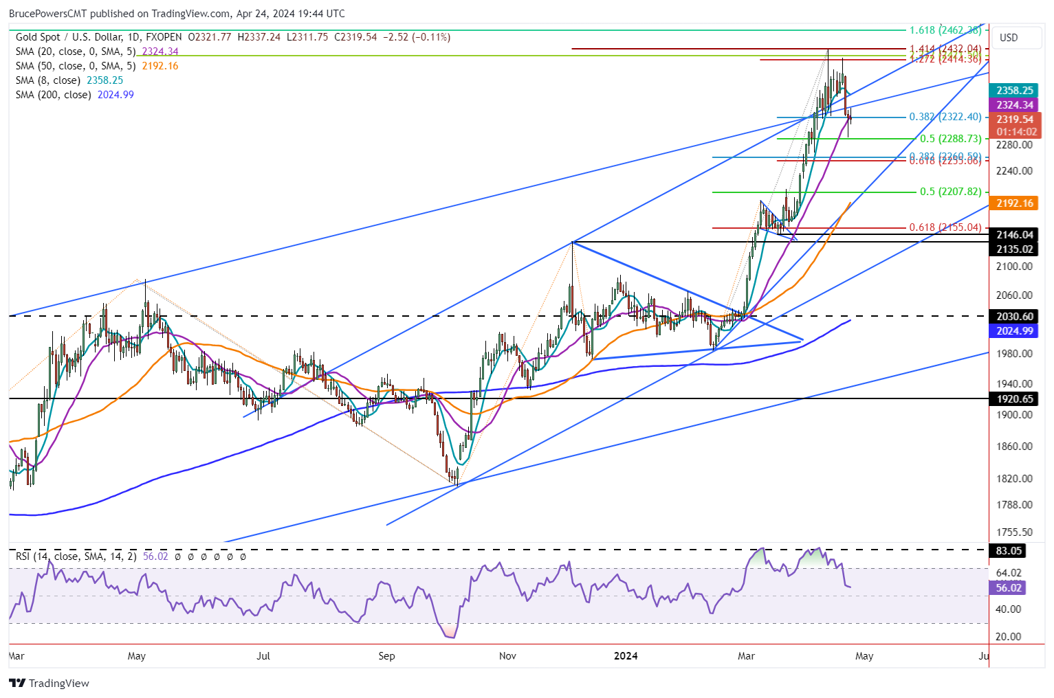 Also, on the bearish side, a daily close below the 20-Day is a bearish indication. Further, today’s low of 2,312 could trigger short-term weakening as gold again approaches yesterday’s low of 2,291. If that low is broken to the downside, then a deeper correction is likely. The next lower target would be around the 38.2% Fibonacci retracement of the full swing that began from the February swing low. That price level is at 2,261 and includes the 61.8% retracement of the internal upswing at 2,255.