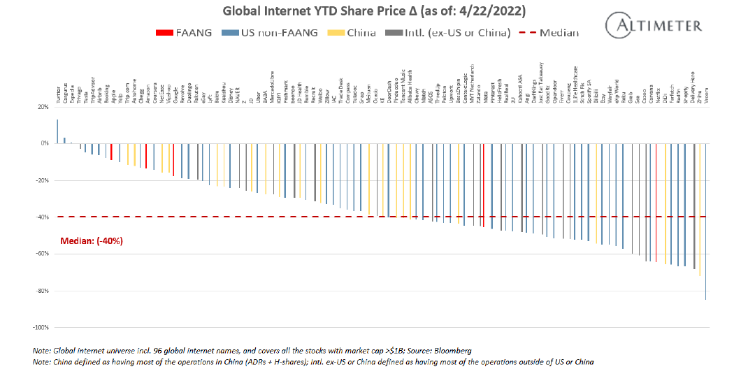 I thought the below graphic from my friend Freda at Altimeter illustrated the situation well. As of April 22, the median internet stock was down ~-40% YTD alone.