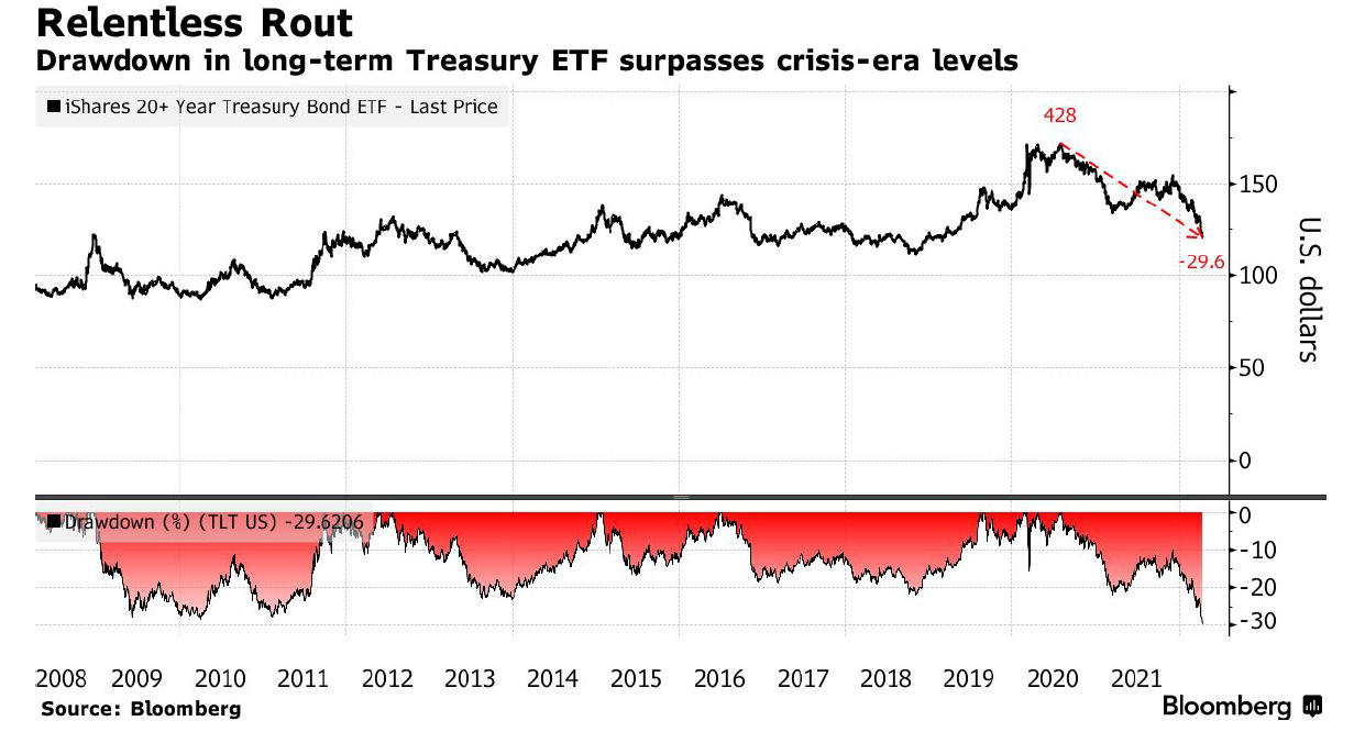 For example, US government long-term bonds have already declined by over -30% since their peak, which is even greater than in 2008 – 10. If essentially risk-free US government bonds are trading at these extremes, it’s only logical that the stock prices of our businesses, which are not only long-duration, but also have business risk as well, will decline even more.