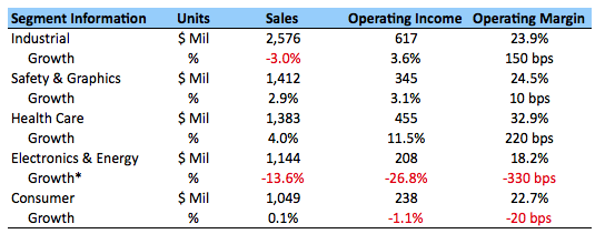- Sales declined in abrasive systems, industrial adhesives and tapes, and aerospace commercial transportation.