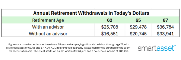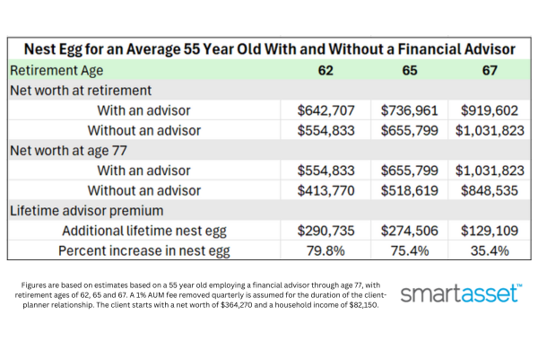 Financial advisors can help contribute to growing a client's nest egg in a multitude of ways. SmartAsset's estimates on the net benefit to this investment pot at age 77, not including any additional retirement income gained from the relationship is as follows.
