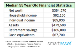 A median 55-year-old tends to have a net worth of around $364,270. This reflects their assets over liabilities, and this cohort tends to have largely paid down their debt. A median individual in this cohort has assets of around $473,500.
