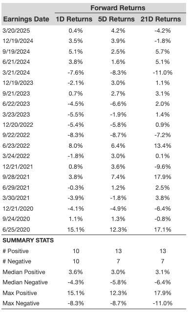 - There are 20 earnings data points recorded over the last five years, with 10 positive and 10 negative one-day (1D) returns observed. In summary, positive 1D returns were seen about 50% of the time.