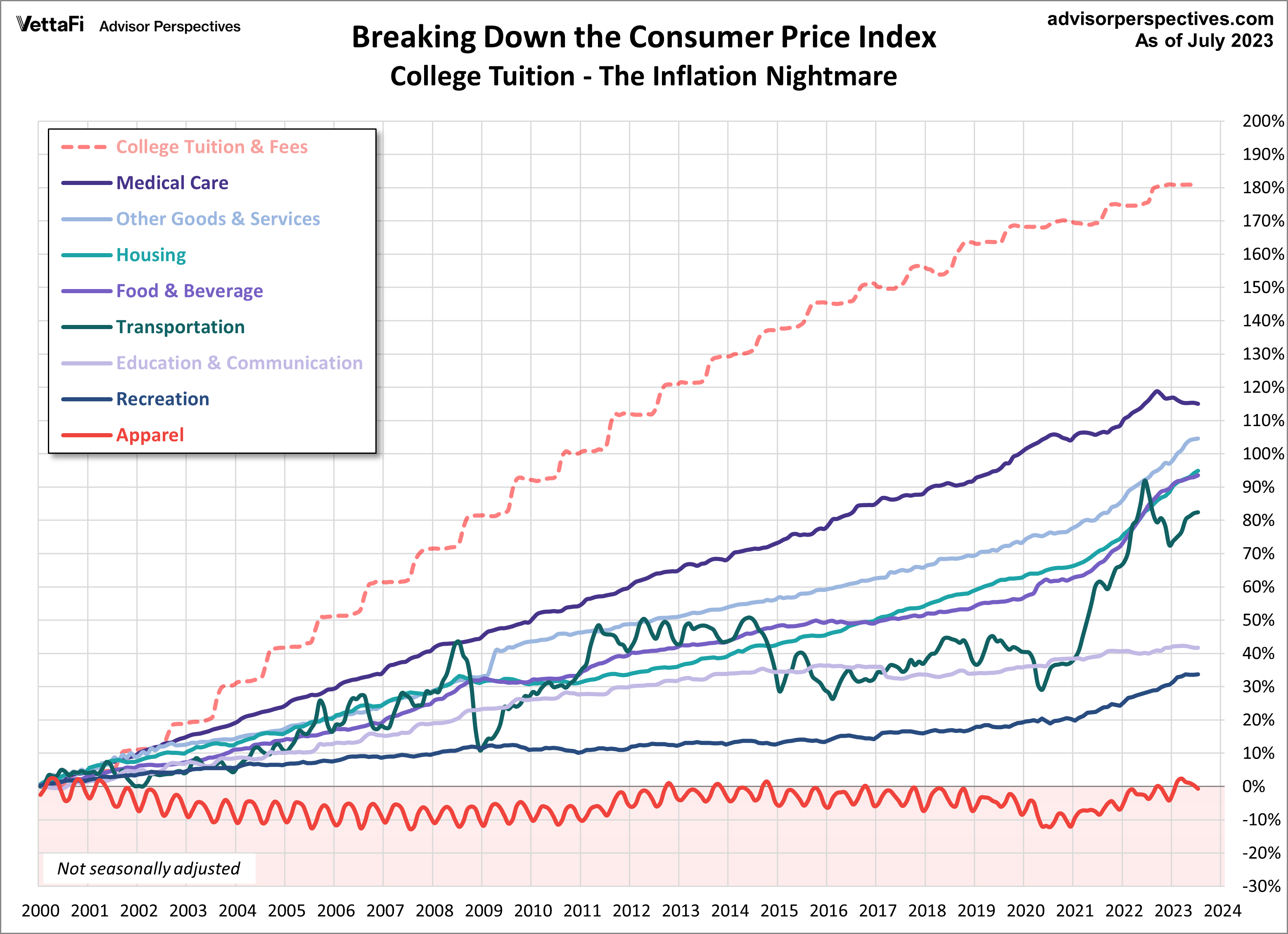 The next chart will come as no surprise to families footing the bill for college tuition. Here we've separately plotted the College Tuition and Fees subcategory of the Education and Communication expenditure category. Note that the steady staircase in this cost matches the annual cost increases in late summer for each academic year.