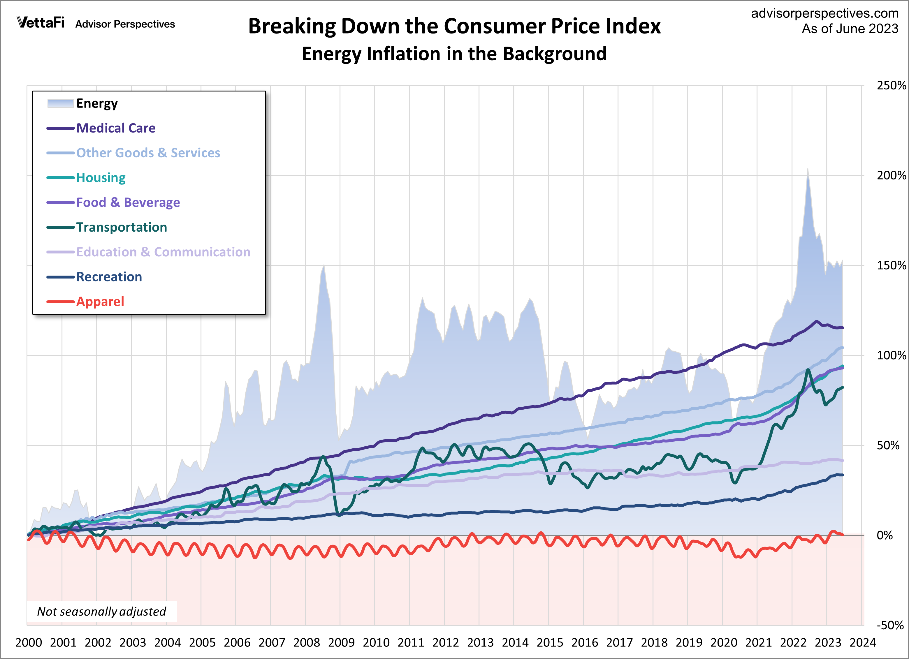 Not surprisingly, Medical Care has been the fastest-growing category. At the opposite end, Apparel deflated since 2000. Another unique feature of Apparel is the obvious seasonal volatility of the contour.