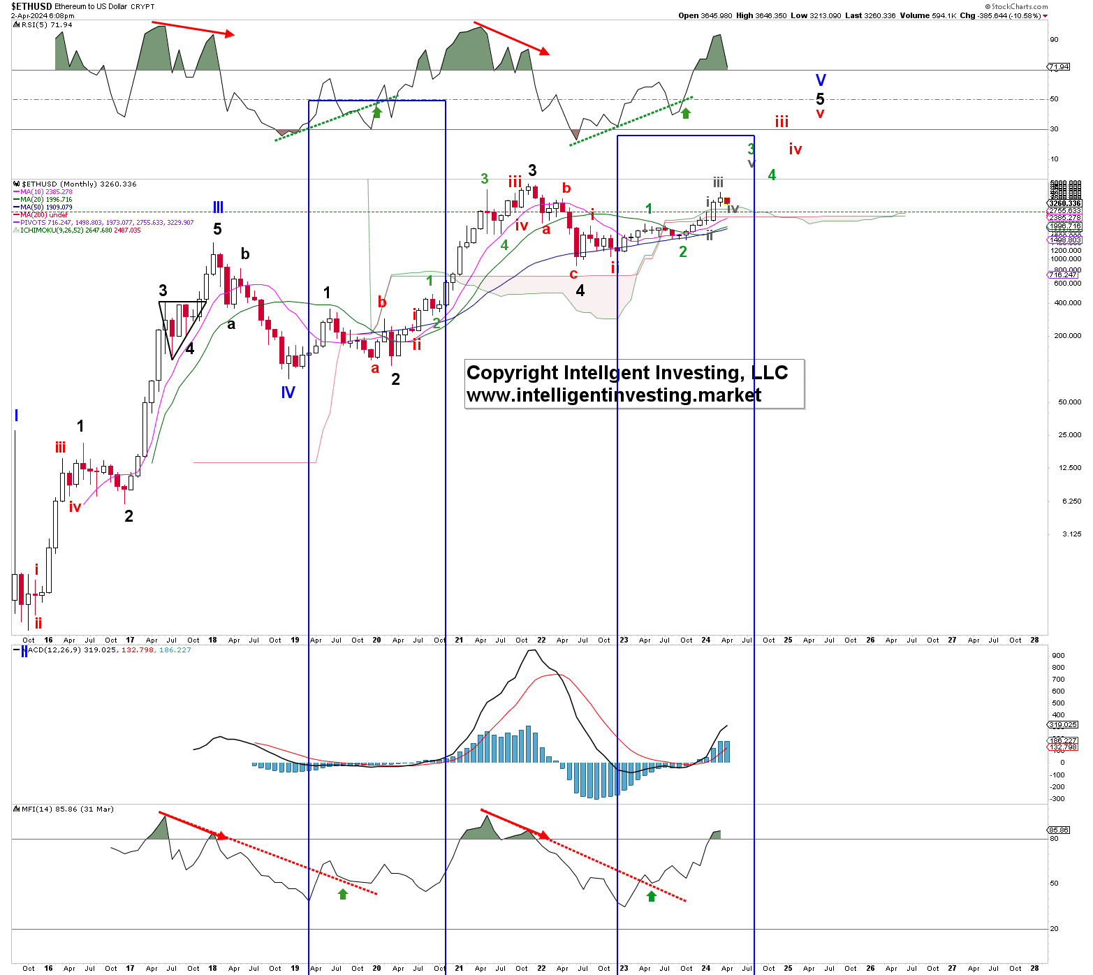 In addition, our big-picture EWP count, see Figure 2 below, shows that Ethereum still needs to wrap up the green W-3, -4, and red W-iii, iv, -v to complete the larger Blue W-V, contingent on holding above the grey W-i high at around $2700: red dotted horizontal line. However, ETHUSD only kicked off Bear markets on negatively diverging RSI and MFI readings (red solid arrows), while the price action in the blue boxes shows the recent RSI and MFI breakout is like that for the 2019-2021 Bull. Thus, based on this TI analysis, we don’t expect a significant top in.