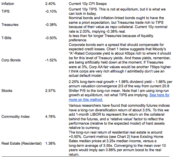 I don't analyze every possible asset class. For this exercise, I limit the universe to stocks, TIPS, nominal bonds (both long Treasury and corporate bonds), commodity indices and (since many of us already own it) residential real estate. My estimates and some notations about the calculations are in the table below.