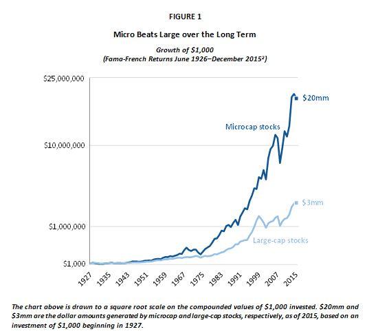 (2) Kenneth R. French Data Library, Tuck School of Business at Dartmouth College. (2015). Retrieved from this site . The date ranges used in this paper begin in June 1926 and end in December 2015. Deciles 2 and 3, used to calculate the microcap returns, have average market caps of $362 million and $732 million, respectively, in 2015 dollars. The returns are weighted by market cap and computed monthly.