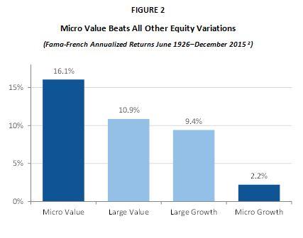 We clearly see that microcap stocks outperform large-cap stocks, but what about style differences between value and growth? Taking the same period as before (June 1926 through December 2015), we ran the Fama-French data to compare the return of the smallest quintile with a high price-to-book ratio (micro growth) to that of the smallest quintile with a low price-to-book ratio (micro value). What we found is striking: The annualized return for micro value is 16.1% versus a mere 2.2% for micro growth. Large value also beats large growth but the spread is far smaller, with large-cap value delivering 10.9% versus 9.4% for large-cap growth.
