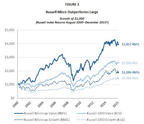 Looking at style differences over shorter periods using the Russell indices yields similar results. The Russell Microcap Value Index gained a strong annualized return of 9.3% versus 4.2% for the Russell Microcap Growth Index (August 2000 through December 2015). The Russell 1000 Value Index returned 6.4% versus the Russell 1000 Growth Index's 2.5% over the same period. This data reinforces the point that, from an asset allocation perspective, smaller stocks with a value tilt outperform all other equity variations.