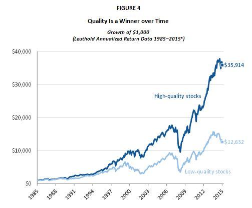 This quality bias has shown to deliver superior performance over time. In fact, according to the Leuthold Group, high-quality stocks outperformed low-quality stocks by 390 basis points on an annualized basis from 1985 through 2015 (5). Leuthold defines high-quality stocks as those with high ROEs, low financial leverage, and stability of earnings and sales.