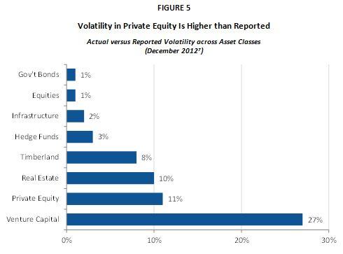 Figure 5 shows the difference between adjusted and reported (from index returns) volatilities for several asset classes. It highlights that private equity and venture capital have far higher actual volatilities than what is reported. High autocorrelations in private equity help prove this to be the case, as most of the return profile's history correlates with itself.