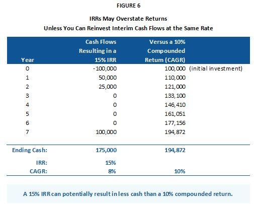 Figure 6 shows how much the assumption that all cash flows are reinvested at the same rate distorts reported IRR. In the first column, the investor puts in $100,000 and receives cash flows of $175,000 over the life of the investment, for an IRR of 15%. However, if this investor had put the same amount in an investment compounding at 10%, the total cash received would be greater. The difference is that the investor must also reinvest those interim cash flows at 15% to actually realize the stated return.
