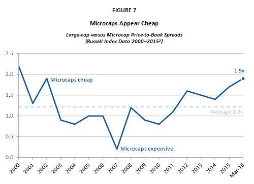 As Figure 7 illustrates, current valuation spreads between microcaps and large caps are wider than they have been historically: The P/B spread between the Russell Microcap Index and the Russell 1000 Index was 1.9x as of March 2016 versus its 15-year historical average of 1.2x.