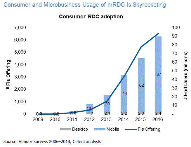 I believe we can expect more widespread adoption of consumer mobile banking services with research and consulting firm Celent pointing to sky rocketing adoption of mobile remote deposit capture (mRDC) . The number of transactions processed by Mobile Deposit is a function of the consumer adoption of the technology, the addressable market and the number of times per consumer the service is used annually. The offsetting factors include the volume of checks being written in the US is declining.