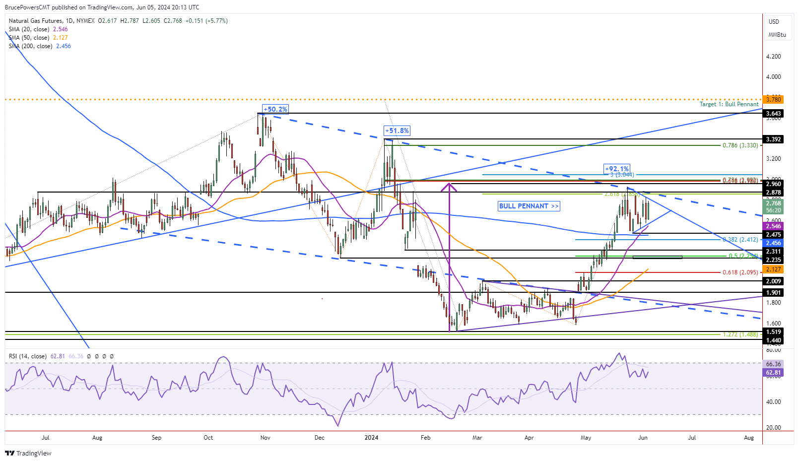 An upside breakout of the pennant is indicated on a decisive rally above yesterday’s high of 2.83. Once the recent trend high of 2.92 is broken to the upside, a bullish breakout of the declining trend channel will also occur. If that happens, the prior swing high of 3.39 becomes the next higher target, followed by the 2023 peak at 3.64. Higher up is the target derived from the measuring objective of the pennant pattern. Its target is 3.78.