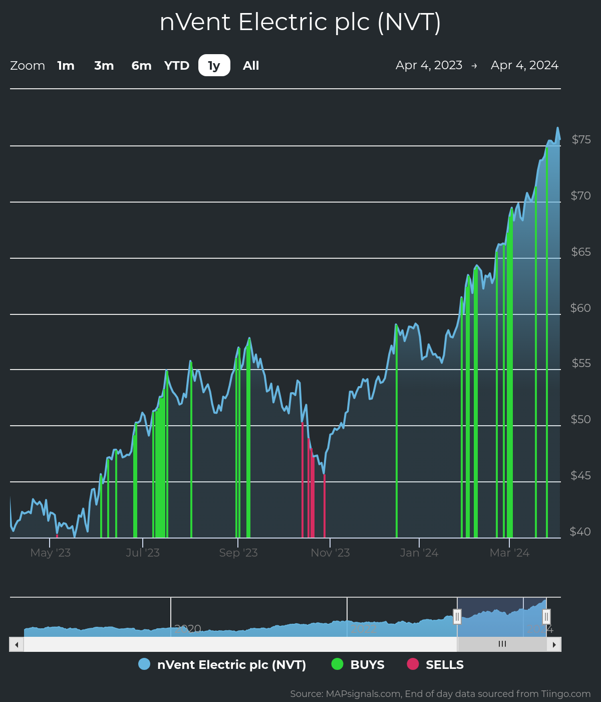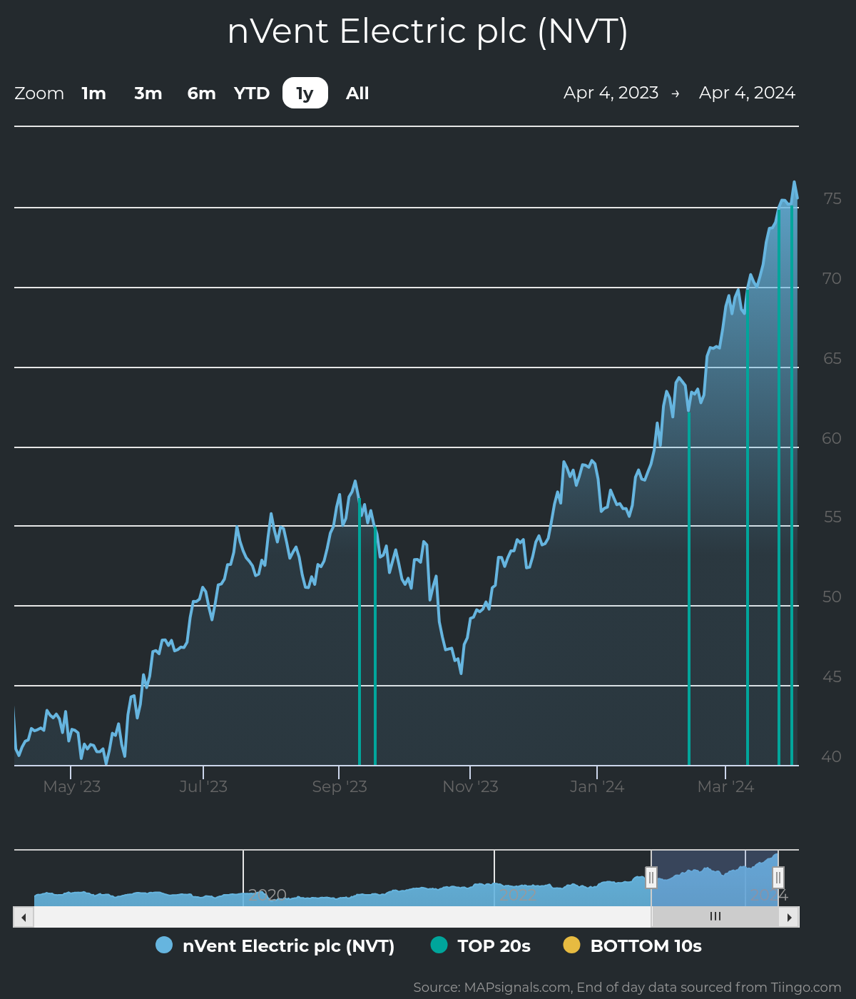 Each green bar signals unusual trading action in NVT stock. The green color indicates our proprietary inflow signal: