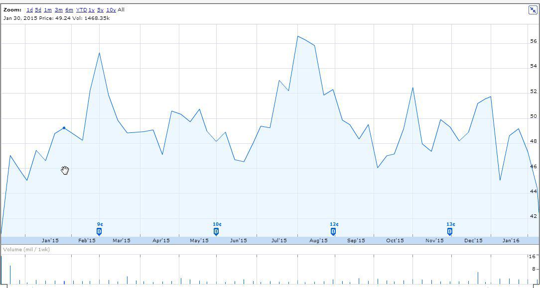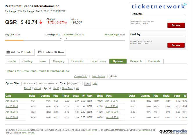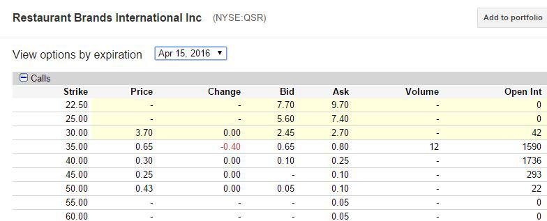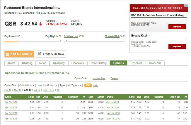 I have been long QSR in the past between $52 and $57. This opportunity came up, because today I noticed the March and April 44 calls losing a ton of value. QSR Canadian options trade in $2 increments. I initiated a position on the April 44 call at $2.05 as the 42s were very expensive now that they are in the money. This 44 call is mostly time value as it is out of the money (since this morning) and has lost over 50% of its last closing price.