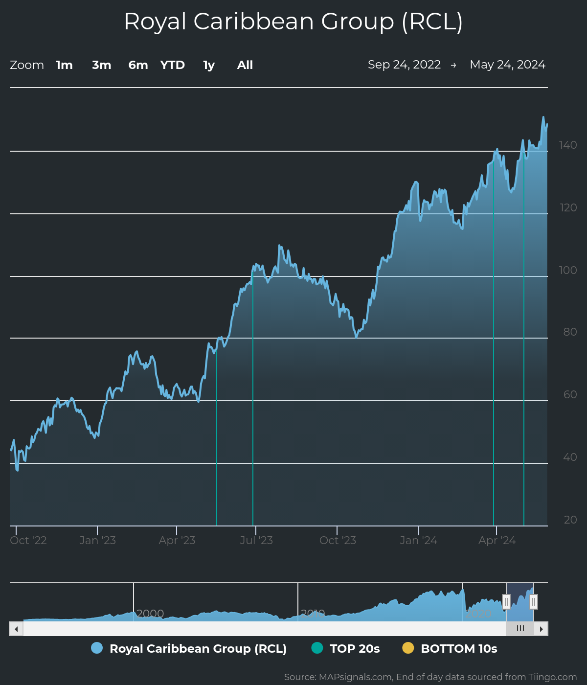 It’s made the rare Top 20 report numerous times. The blue bars below show when RCL was a top pick…sailing higher along the way.