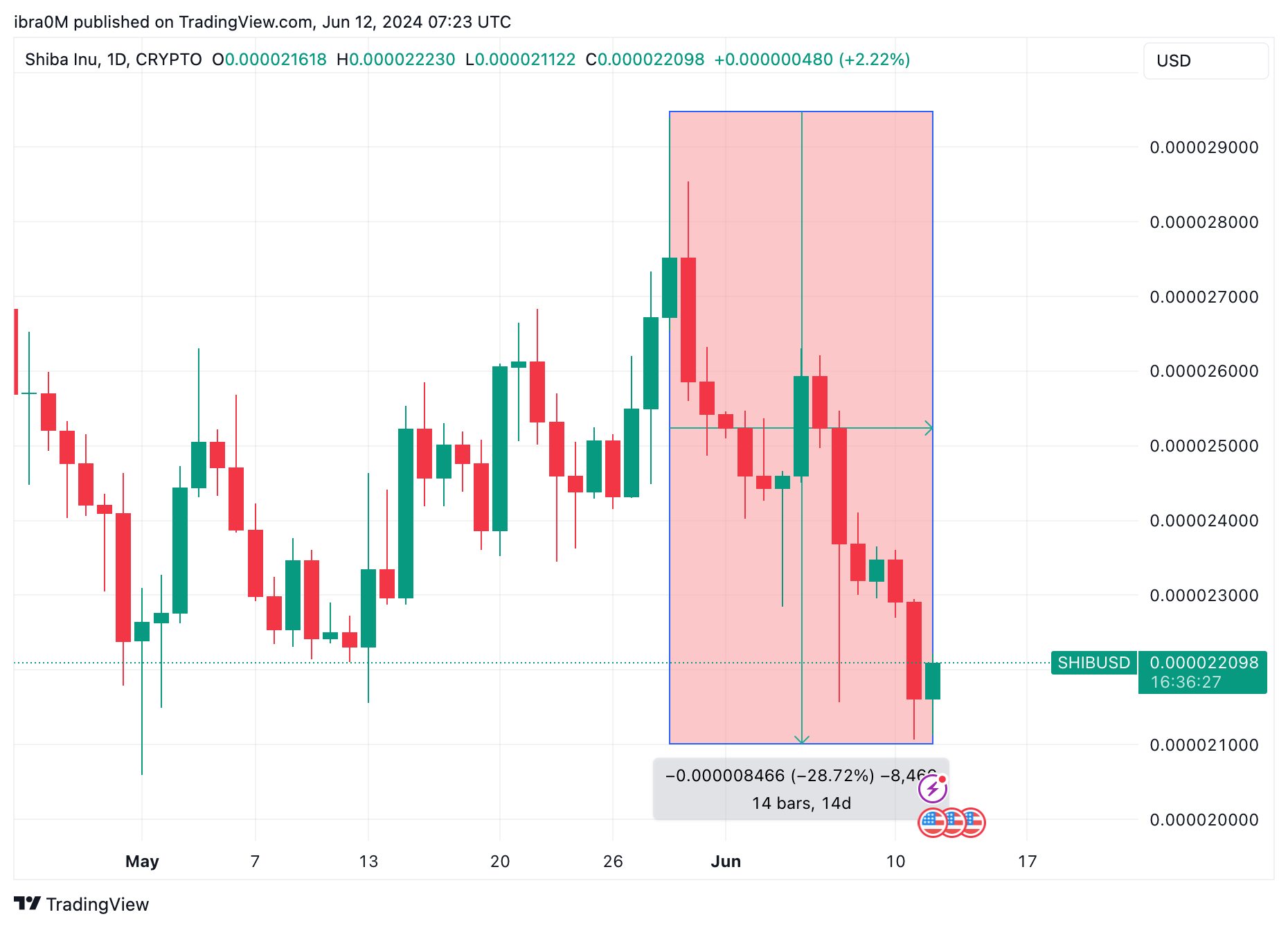 Shiba Inu Price Action (SHIB/USD) | TradingViewThe chart above shows that Shiba Inu’s ongoing price correction is now approaching risky zones. At the time of writing on June 12, SHIB price has now declined by 29% since the downtrend began around May 29.