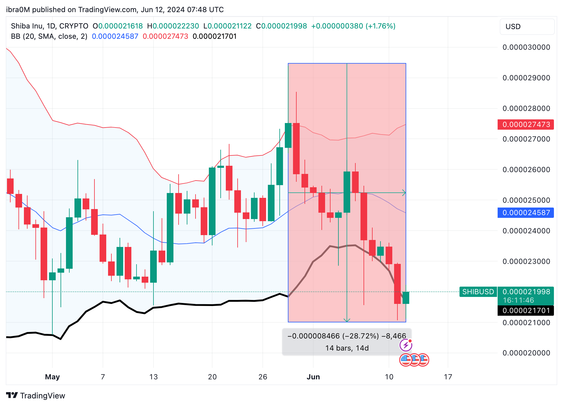 In effect, SHIB price now looks likely to tumble towards the $0.000020 area support level as the June 2024 unfolds.