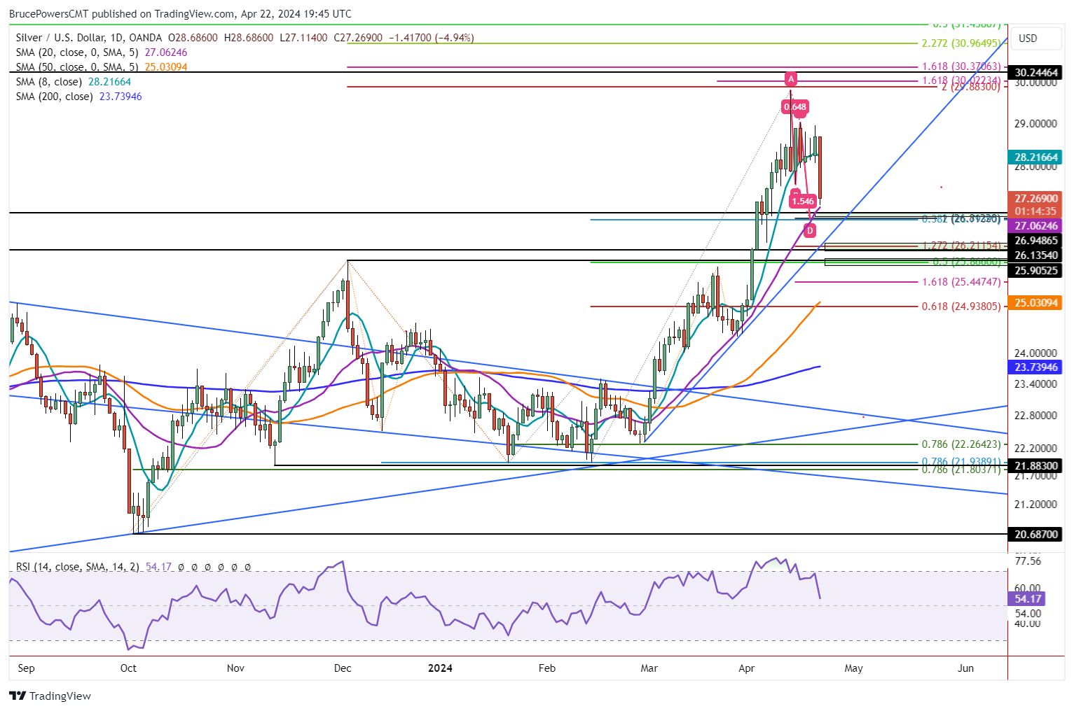 Silver triggered a bearish reversal on its weekly chart on Monday with a decisive drop below 27.59. Selling picked up during the drop with silver continuing to trade near the lows of the day at the time of this writing. The first key target around the 20-Day MA at 27.06 has almost been reached. It ties to the March 2022 swing high at 26.95. Moreover, the 38.2% Fibonacci retracement is at 26.79 and a falling ABCD pattern (marked on chart) completes at the same price. Together, these initial downside targets can be watched as a potential support zone from 27.06 to 26.79.
