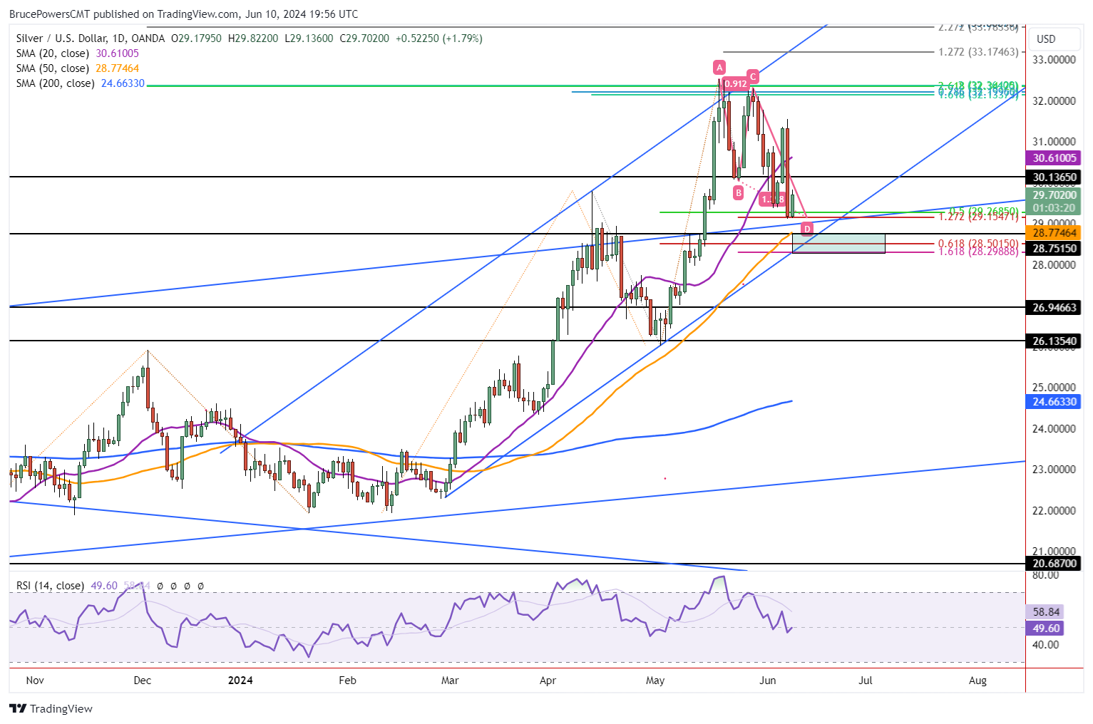 The 50-Day MA is currently around 28.78. A little below the uptrend line is a price range from 28.50 to 28.30 consisting of the 61.8% Fibonacci retracement and the 161.8% extended target for the declining ABCD pattern. Notice that the 50-Day line is now aligned with a prior swing high from May 18 at 28.75.