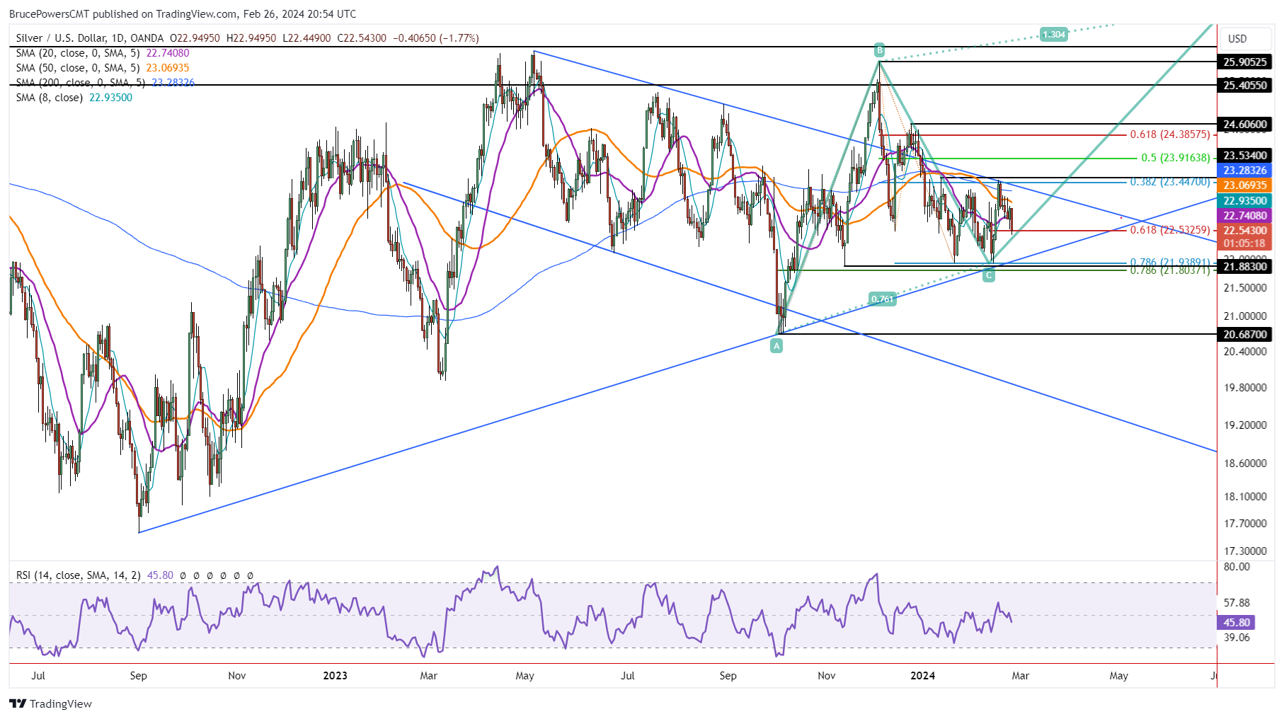 Silver pulled back to test support at the 61.8% Fibonacci retracement on Monday with the day’s low of 22.45. The 61.8% price level is 22.53. At the time of this writing, silver continues to trade near the 22.52 price zone. A daily close above the 61.8% retracement level at 22.52 will be a stronger indication than a close below that level.