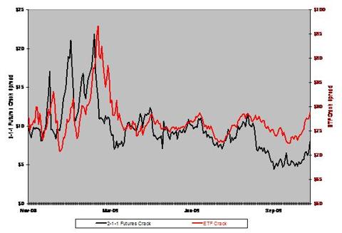 You can see that the ETF version tracks the 2-1-1 crack fairly well, although not exactly. The differential is due to a couple of factors. First of all, the ETF spread reflects the last sale data typically available to retail investors, while the futures spread is based upon settlement values, not last-sale data. Using end-of-day bids or fund NAVs would narrow the apparent difference significantly.
