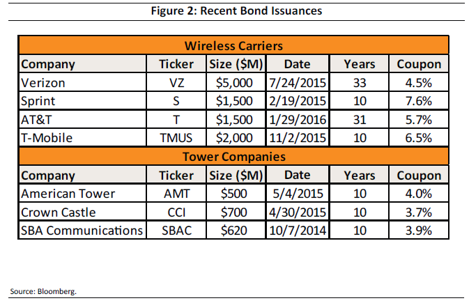 The permanent capital raised in the transactions by both AT&T and Verizon can be compared to their weighted average cost of capital, or WACC. In 2015, VZ raised $5 billion in the bond market with a coupon of 4.5% and a maturity of 33 years, and AT&T raised $1.5 billion at a 5.7% coupon with a maturity of 31 years in 2016. Figure 2 contains the cost of some recent bond issuances for both carriers and tower companies. After factoring in the cost of equity, which is traditionally much higher than debt costs, a sale of towers below a carrier's WACC creates immediate value for a carrier. As shown by the lower issuance coupons, the tower companies can afford to pay these high multiples (low yields) thanks to their low cost of capital and the expected revenue growth from increasing the number of tenants. Therefore, it should be no surprise that 80% of US towers are owned by the three publicly traded tower companies: AMT, CCI, and SBA Communications (NASDAQ: SBAC ).