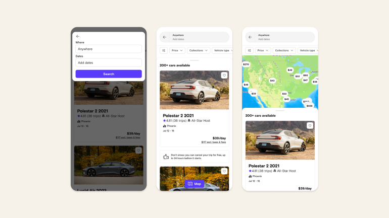 Instead, Turo puts the car’s make and model front and center. Now, upon landing on Turo’s site or launching the app, users are encouraged to browse all of Turo’s available vehicles without committing to a date or location.
