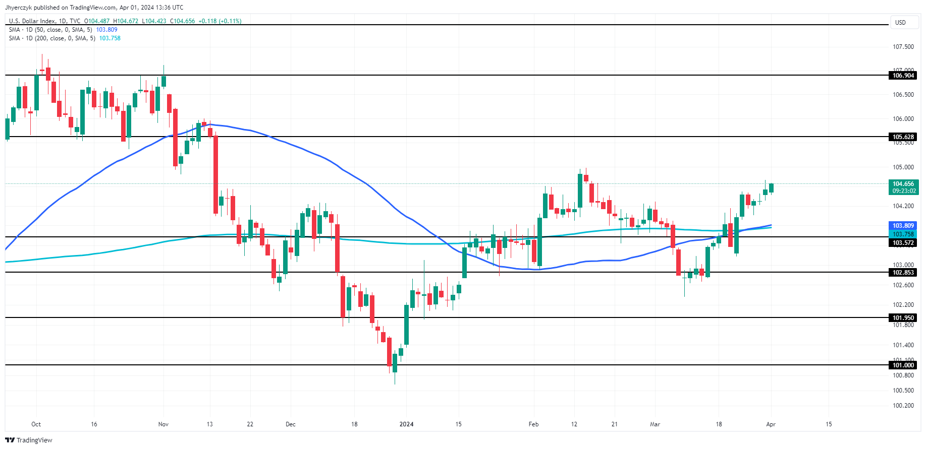 The US Dollar Index is edging higher on Monday, putting itself in a position to challenge the February 14 main top at 104.976. A trade through this level will signal a resumption of the uptrend with the next target the November 10 main top at 106.006.